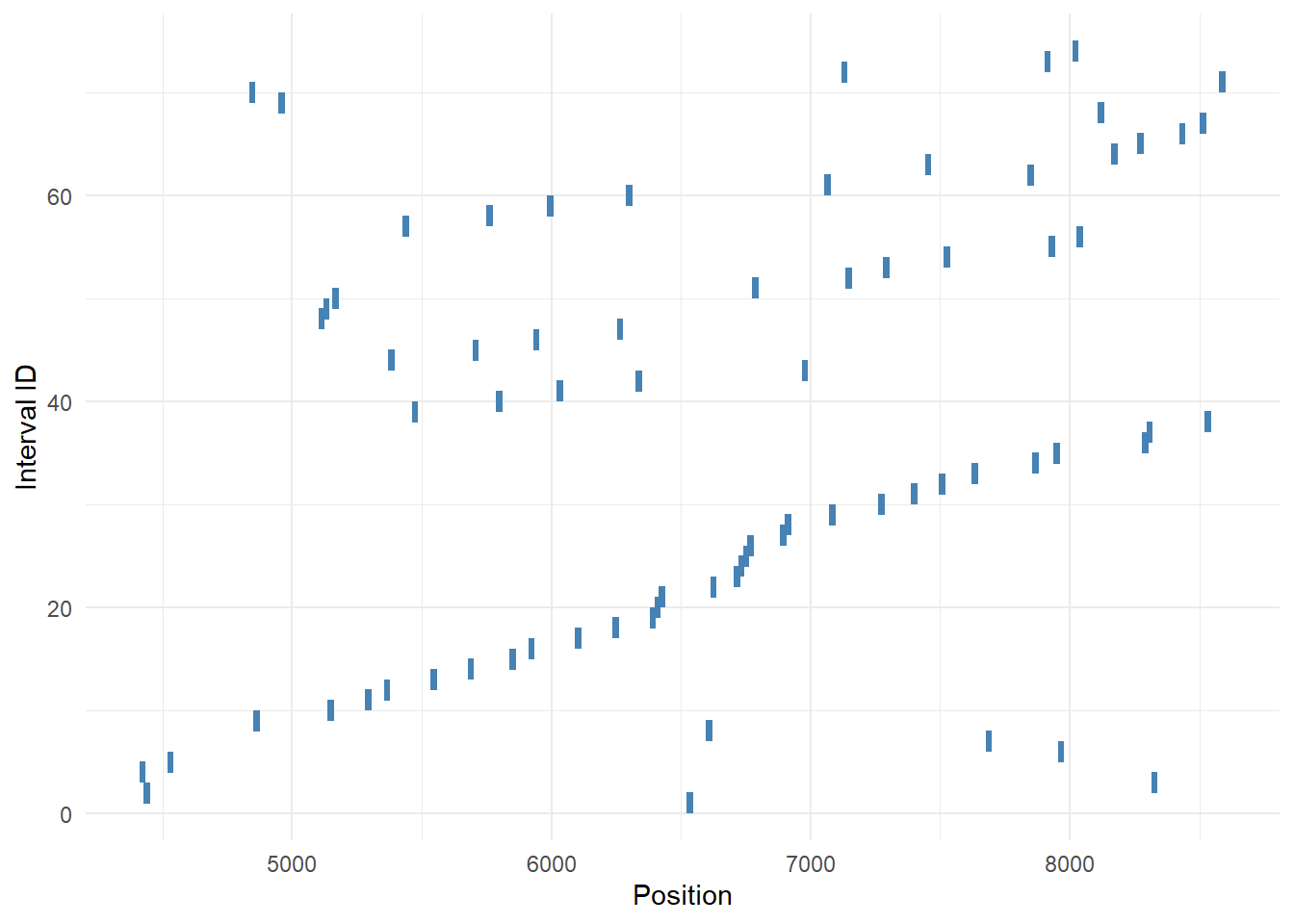The relevant columns here are V7 and V8. These show, respectively, the beginning and end position of the predicted binding region in the gene’s scaffold (V2). If these 74 predicted binding locations are actually just extremely similar “variants”, we’d expect many rows to share very similar V7 and V8 values. When I eyeball the table I don’t see that trend, but let’s check it rigorously to be sure.